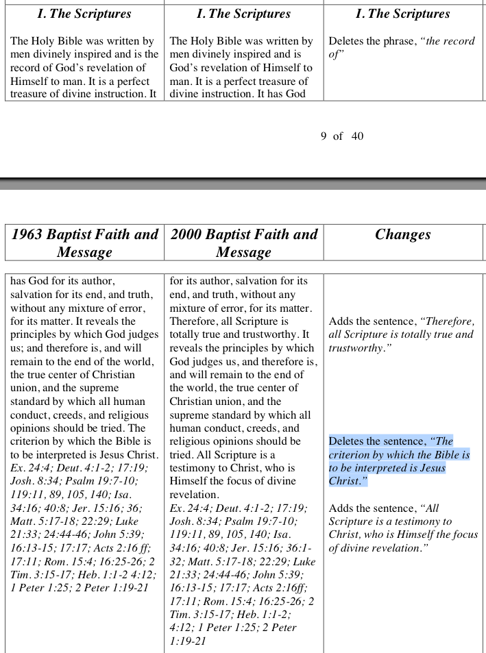 (Taking the scenic route to prove my point.) Many people will rant about one side or the other when it comes to the 1963 and 2000 Baptist Faith and Message. And I have decidedly taken a position, but it not for reasons often stated. For me the major issue lies with the section on Scripture. In this section the 2000 deleted a crucial phrase, “The criterion by which the Bible is to be interpreted is Jesus Christ.” (Click on the image to see a picture of side comparison – I highlighted the specific change.)