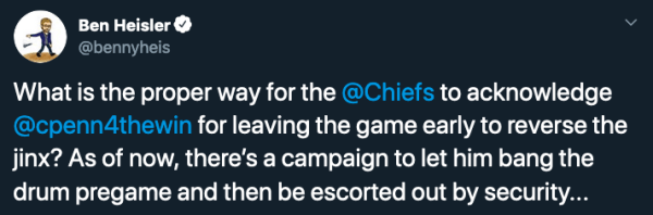 As the Texans broke out to a 24 lead over the Chiefs @cpenn4thewin realized he was the jinx and needed to leave the stadium. $258 ticket aside, he walked out, tweeting a video that the Chiefs could now win the playoff game. And of course the Chiefs scored 41 unanswered points, seven straight touchdowns.