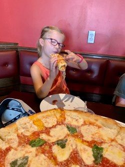 The pizza arrived thin crust, NY style. Darcy held her slice by crust. It was limp, bending toward the table. “How do I eat this?”, as she raised the piece above her head and tried a bite from underneath. We explained that you fold it. So she rolled it up from the crust. The crust became the middle of what looked like a burrito. Darcy was thrilled.