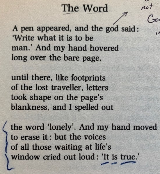 Thomas’s poem is titled “The Word”. This seems to represent what it means to be human: “lonely”. But poetry always has deeper meaning and Thomas was a Christian minister. When a believer writes “The Word” they can not help but think of John 1. “the Word was with God, the Word was God… the Word became flesh.”