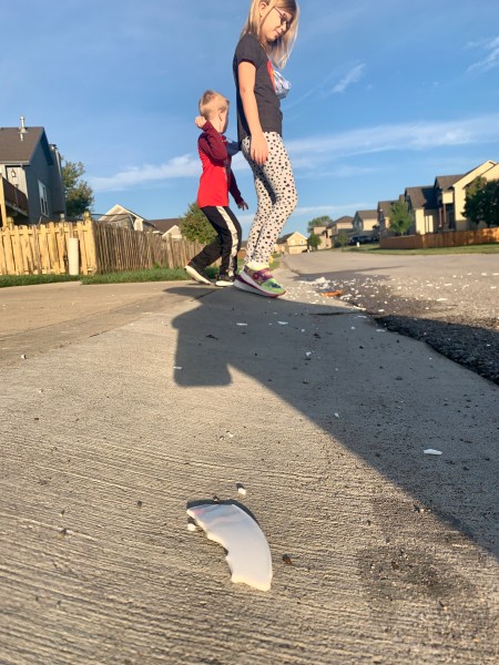 As we got out to inspect apple butter toast remains (Corelle doesn’t break; it shatters!) our neighbor came running up, “what happened?!!”. Soon she was laughing. As I took a picture, I snapped E throwing plate shards.
