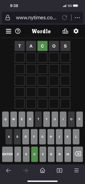 I am sure there are wiser paths to victory, but I always begin with a word on my mind. For instance, today I started with “Tacos”. Yum! The game eliminates the wrong letters and lets me know if I have right letters in the correct (green) or incorrect (gold) place. My strategy, choosing what is on my mind, works. It helps that there are only 26 letters, and 6 tries adds up to 30 letters!