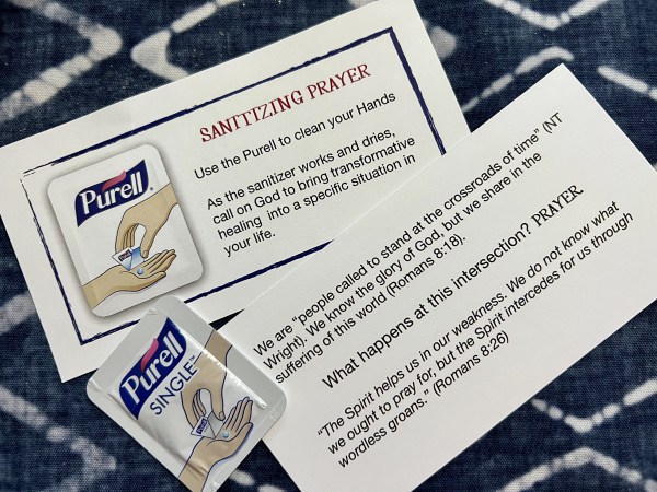 Then I remembered the prayer sanitizer. I had a ton remaining. So I went to the van to grab the box and started sanitizing. Including my feet, which walked through the danger zone. Each time I got up, more sanitizing. And each time I took a packet I was reminded of prayer.