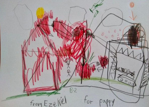 Ezekiel and I met my parents for breakfast. Skipping a bit of school (sorry Mrs Bonham!). I brought paper and colored pencils. I loved to draw with my dad when I was little and so does E. They quickly penciled a set of tanks for a battle. Dad’s had a bigger turret and extra machine guns. So Ezekiel added a second massive canon. A secret weapon. Dad was convinced this was the end for him. But E said not to worry and quickly drew a square with spikes around dad’s tank.
